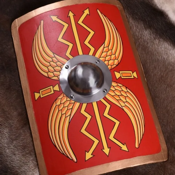 Dieser römische Schild für Kinder (Scutum) ist nach Originalen gefertigt, die von römischen Legionären verwendet wurden. Diese Art von Schild wurde vom 1. bis zum 2. Jahrhundert n. Chr. Im ganzen Römischen Reich getragen. Dieser kleine Abschaum ist für Kinder sehr leicht zu tragen. Das Design entspricht voll und ganz den größeren Originalmodellen.