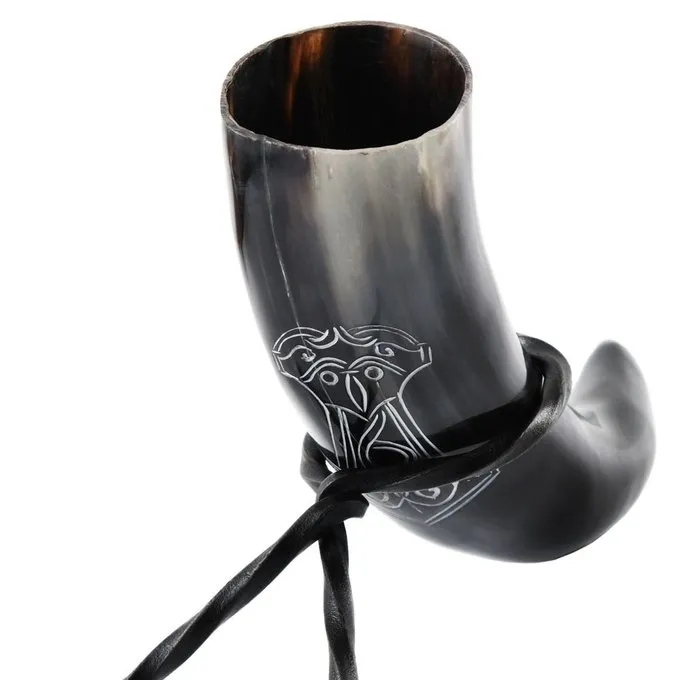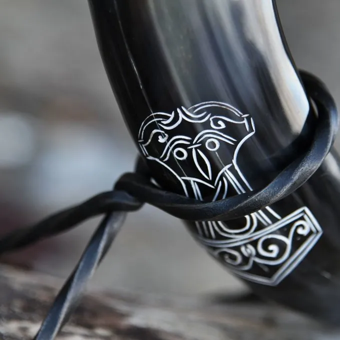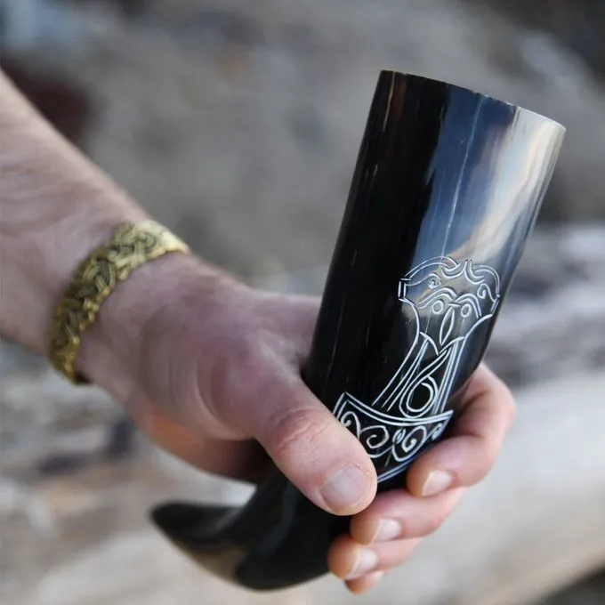 Im Laufe der Jahrhunderte wurde das Trinkhorn von verschiedenen Völkern als Kelch bei Zeremonien und Feiern verwendet. Der Gebrauch des Trinkhorns wird sogar in der Edda erwähnt. Dieses Horn ist perfekt für Wikinger-Reenactment, Wohnkultur, LARP und ein wunderbares Geschenk. Dieses Trinkhorn ist aus Büffelhorn handgefertigt und poliert. Es wird mit einem Metallständer geliefert, mit dem Sie es auf den Tisch stellen können. Das Horn ist mit einem Mjölnir graviert. Dies ist der Hammer von Thor, dem Wikingergott des Donners und der Stärke. Der nordischen Mythologie zufolge wurde Mjölnir vom Zwerg Brokkr geschmiedet und verfehlt nie sein Ziel, nachdem er geworfen wurde. In der modernen Gesellschaft ist der Mjolnir ein Symbol des Heidentums und Asatru.
