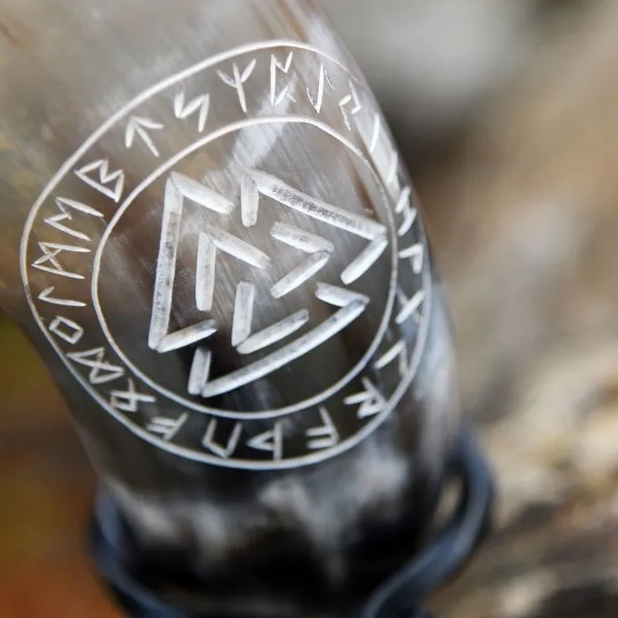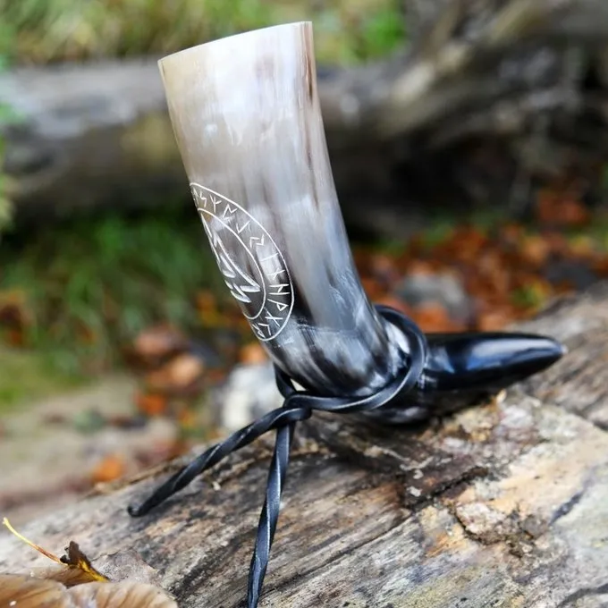 Im Laufe der Jahrhunderte wurde das Trinkhorn bei Zeremonien und Feierlichkeiten von verschiedenen Völkern als Tasse genutzt. Die Verwendung des Trinkhorns wird sogar in der EDDA erwähnt. Dieses Horn ist perfekt für die Nachstellung von Wikinger, Wohnkultur, LARP und macht ein wunderbares Geschenk. Es ist auch ideal für Festivals. Dieses Trinkhorn wird aus Büffelhorn aus handgemacht und poliert. Im Inneren gibt es eine Lackschicht, damit Sie aus dem Horn trinken können. Es kommt mit einem Metallständer, mit dem Sie ihn auf den Tisch legen können. Das Horn ist mit einem Valknuss eingraviert. Dieses Motiv besteht aus drei Dreiecken und erscheint auf einer Reihe von Objekten germanischer Völker. Seine Bedeutung ist nicht sicher, aber es wird angenommen, dass es Odin symbolisiert. Heute ist es ein beliebtes Symbol für Heidentum und Asatru.