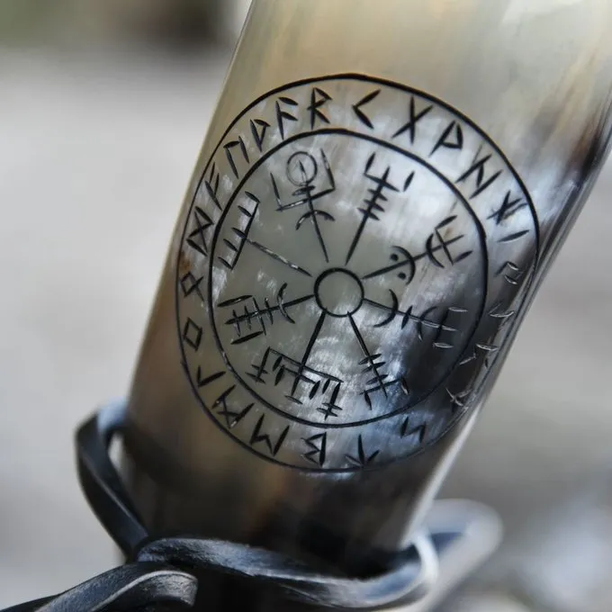 Im Laufe der Jahrhunderte wurde das Trinkhorn bei Zeremonien und Feierlichkeiten von verschiedenen Völkern als Tasse genutzt. Die Verwendung des Trinkhorns wird sogar in der EDDA erwähnt. Dieses Horn ist perfekt für die Nachstellung von Wikinger, Wohnkultur, LARP und macht ein wunderbares Geschenk. Es ist auch ideal für Festivals. Dieses Trinkhorn wird aus Büffelhorn aus handgemacht und poliert. Im Inneren gibt es eine Lackschicht, damit Sie aus dem Horn trinken können. Es kommt mit einem Metallständer, mit dem Sie ihn auf den Tisch legen können. Das Horn ist mit einem Gemüse eingraviert. Das Vegvissir ist ein Symbol aus dem isländischen Huld -Manuskript, einem okkulten Zauberbuch aus dem 19. Jahrhundert. Vegvissir bedeutet: das, was den Weg zeigt. Wer dieses magische Symbol trug, würde sich während eines Sturms nicht verlaufen. Es ist nicht bekannt, ob die frühen mittelalterlichen Wikinger dieses Symbol kannten. Aber in der modernen Wikingerkultur und unter Neopaganen spielt sie eine wichtige Rolle und hat einen neuen Kontext erhalten.
