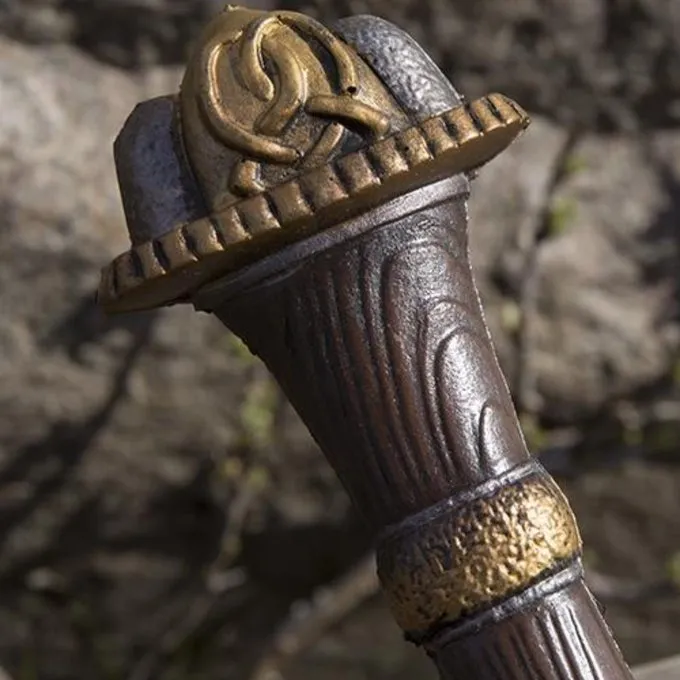 Das LARP Jarl Schwert ist von historischem keltischem und Viking Design inspiriert. Es hat schöne Details. Der Griff hat eine handlackiert und Struktur, die wie Kirschholz aussieht. Auf dem Knauf im Griff und auf der Parierstange gibt es schöne Messing-Details mit Nordic Knoten Motiven. Die Klinge ist auch lebensecht bemalt. Dies ist die perfekte Waffe für Larp Zeichen wie Druiden, Kelten, Wikinger, Ritter, Grafen, Jarls und dergleichen.