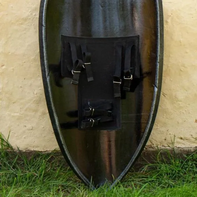 Dieser LARP Schild ist auf den Drachen Schilde basiert, die im Mittelalter (12. Jahrhundert) in Westeuropa verwendet wurden. Ein perfektes Schutzschild für mittelalterliche LARP oder andere Szenarien. Der Schirm kann den linken und den rechten Arm auf beiden mit den sechs Leinwand Riemen getragen werden. Der Schirm ist recht groß und bietet einen hervorragenden Schutz beim Kampf. Die Oberfläche ist schwarz und scheint aus Holz zu sein. Die Kanten sind auch sehr realistisch gemalt und schaut, wie sie wirklich aus Stahl bestehen.