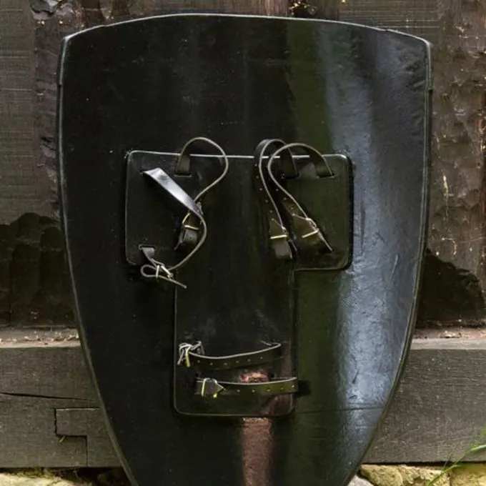 Dieser LARP Schild befindet sich auf dem historischen Drachen Schilde basiert, die während des Hochmittelalter verwendet wurden. Dies waren auch die Schilde, die entlang auf Crusades gebracht wurden. Dieses Schild ist mit einem weißen und schwarzen Hintergrund mit einem roten Ritter Templerkreuz verziert. Der Schirm wird gemalt so lebensecht, dass es sieht aus wie Sie die Maserung des Holzes durch die Farbe sehen. Der Rand erscheint nur aus Stahl einschließlich Nachahmung Stahlnieten zu werden. Der Schirm hat drei Paare aus Lederriemen auf der Rückseite, so dass Sie es an beiden Armen auf verschiedene Weise tragen.