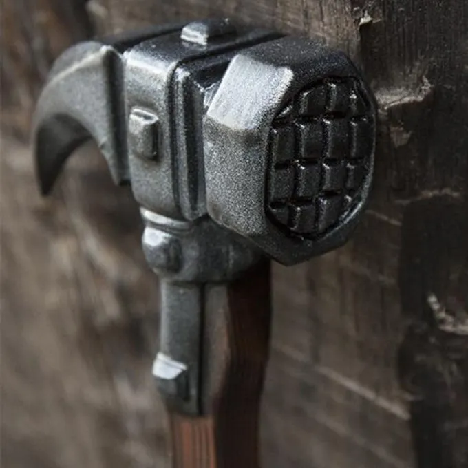 Dieser LARP-Kriegshammer basiert auf echten Kriegshammern aus dem späten Mittelalter. Diese LARP-Waffe ist naturgetreu lackiert, damit sie aussieht wie ein Holzschaft mit Metallkopf und Stahldetails. Der Griff ist mit braunem Leder umwickelt.