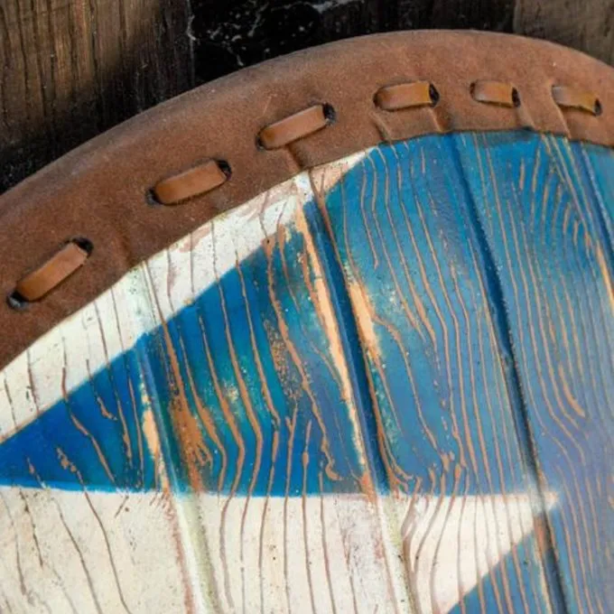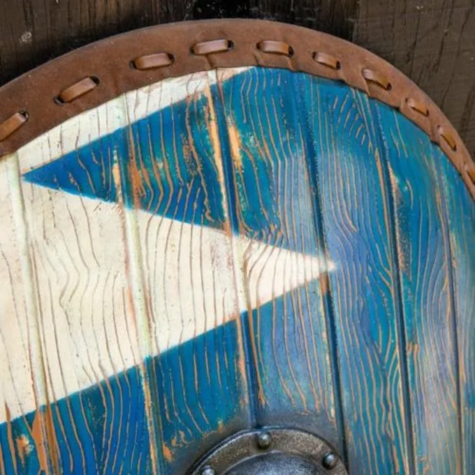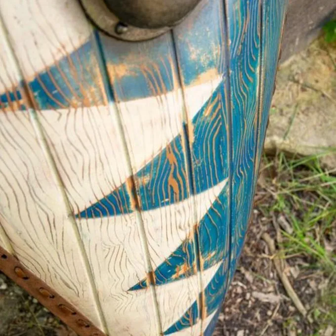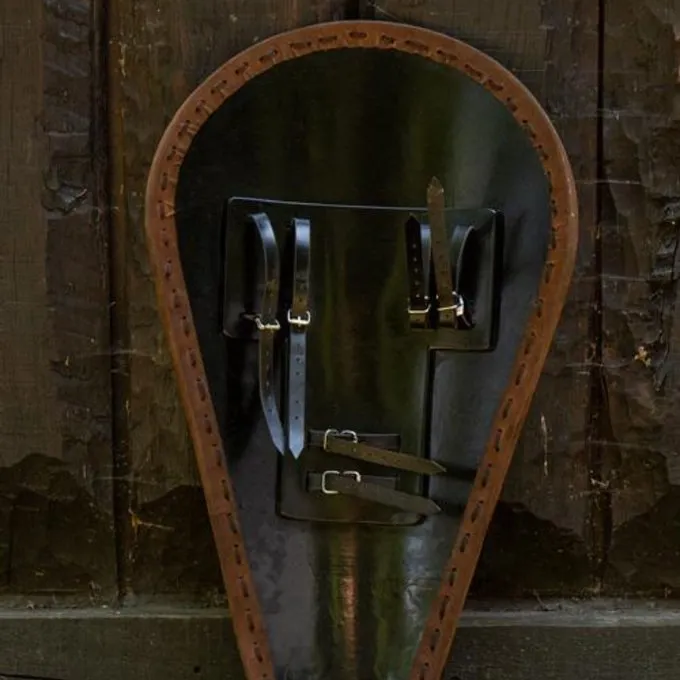 Dieser LARP Schild basiert auf historischen Norman Schilde. Sie wurden ursprünglich für Kavalleristen gemacht, aber waren auch beliebt bei den Fußsoldaten, weil sie ihre Beine schützen könnte. Sie benutzten Schilde wie dies bei der Eroberung England. Der Schirm ist schön und lebensecht bemalt, so dass es aussieht wie es aus vertikalen Holzbohlen gefertigt, die mit blau weiß lackiert sind, durch die man die Maserung des Holzes sehen. Es ist für die kleinsten Details mit vieler Liebe gemalt, so hat es auch ein abgenutztes Aussehen als normal für das Schild eines Kriegers ist. Der Rand scheint wirklich aus Leder wird. Der Schirm Chef ist auch lebensechter, komplett mit Kunststahlnieten. Die Rückseite des Schildes hat mehrere Gurte, so können Sie ihn an beiden Armen tragen und in verschiedenen Positionen.