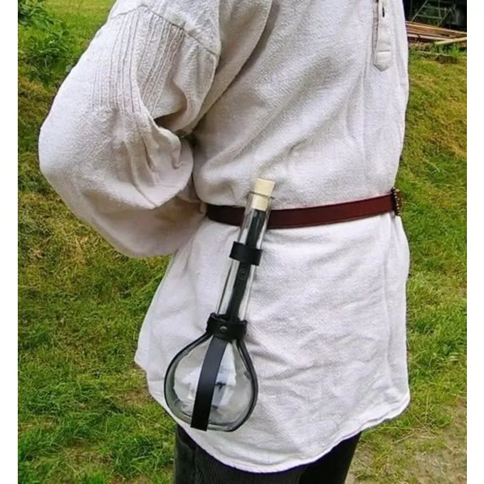 Eine elegante und handliche Flasche für Spirituosen tragen. Diese Flasche hat ein Volumen von 0,5 l und misst 26 x 10 x 10 cm. Es ist mit einem Holzdeckel vorgesehen, so kann es vollständig luftdicht verschlossen werden. Die Flasche ist mit einem schwarzen Ledertasche versehen, so kann es auf das Band aufgehängt werden.