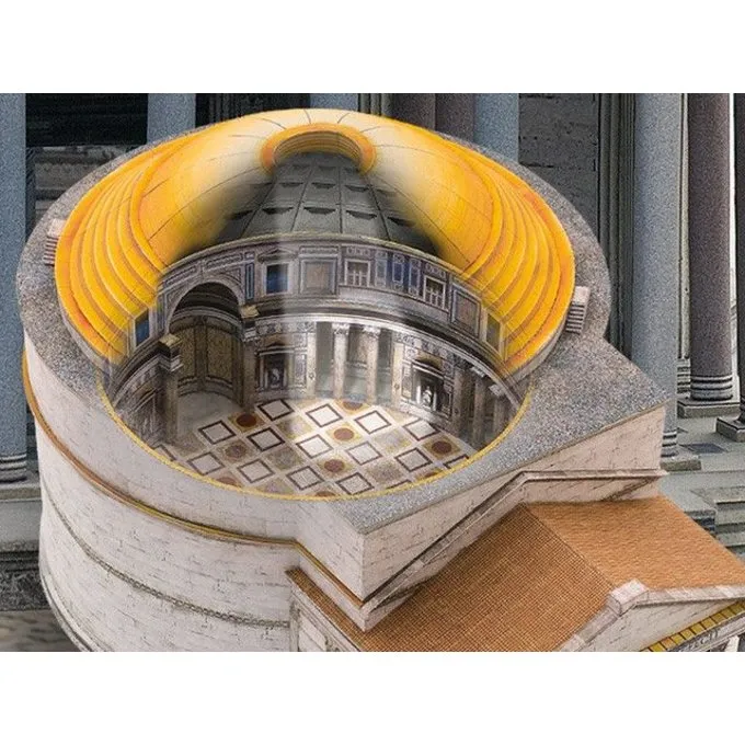 Das Pantheon ist vielleicht die eindrucksvollsten römischen Gebäude, das jemals geschaffen. Dieses Modell Bausatz ist in acht Farben Karton und gedruckt gemacht. Es basiert auf einem Maßstab 1: 300 und hat einen durchschnittlichen Schwierigkeitsgrad. Das Modell misst nur 28 x 19 x 16 cm. In der Mitte der Kuppel ist offen für den Himmel zu schauen. Das Gebäude verfügt über einen schrägen Boden das Regenwasser ablaufen kann. Die Haube ist aus unbewehrtem Beton, eine römische Erfindung. Das Pantheon, umgebaut von Kaiser Hadrian in 125, war bis zum 16. Jahrhundert der größte Verkippung Kuppel der Welt.