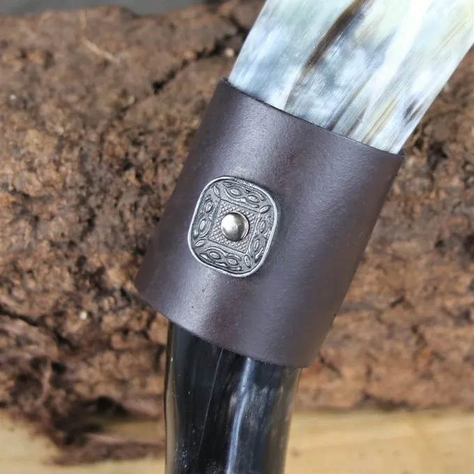 A Mytholon Lederhalter für Trinkhörner und Signalhörner. Mit diesem Halter hängen Sie Ihr Horn am Gürtel, so dass Sie es immer zur Hand haben. Ein perfektes Accessoire für LARP, Festivals, Messen und mittelalterliche Nachstellung. Wenn Sie nicht auf einem Festival sind, können Sie den Halter zu Hause hängen und Ihr schönes Horn an. Der Halter hat eine Dekoration auf der Vorderseite. Es ist für die Hörner mit einer Größe von etwa 0,4 bis 0,7 L. trinken