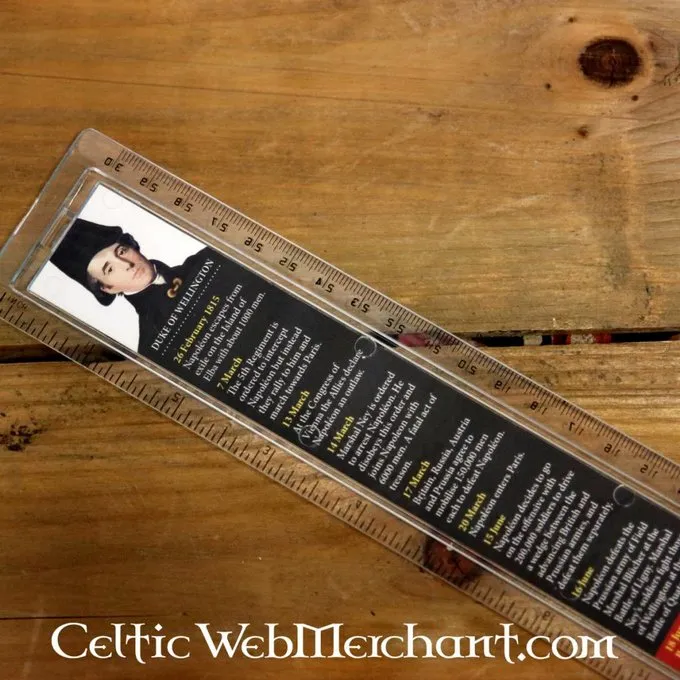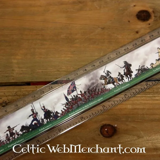 Dieser Kunststoff Lineal zeigt ein Panorama von der Schlacht von Waterloo. Es zeigt verschiedene Armee Kontingenten, um ein besseres Verständnis für ihre Taktik und Ausrüstung. Die Rückseite gibt einen Zeitplan der Höhepunkte der napoleonischen Kampagnen und die Schlacht von Waterloo.