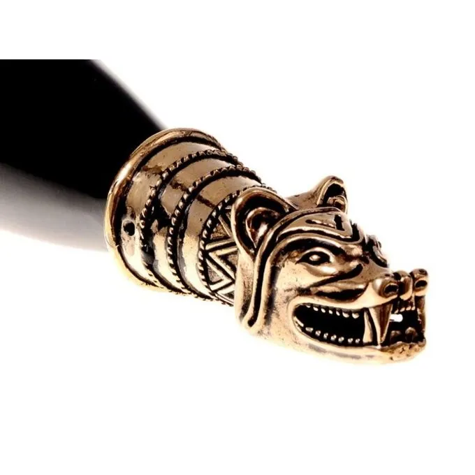 Dieses schöne exklusive Trinkhorn ist mit einer Bronzewolfskopf verziert. Ein großer Zusatz für Ihr Kostüm, sondern auch eine schönes Kunstwerk zu Anzeige auf dem Tisch, oder Ihren Lieblings-Alkohol trinken zu Hause. Das Ende des Horns basiert auf einem Original in Schottland ausgegraben und ist auch separat erhältlich. Das Horn hat eine Kapazität von ca.. 0,4-0,45 Liter und ist für das Trinken kalte Getränke geeignet. Trinkhörner wurden für das Trinken während der Feste und Zeremonien seit der Antike und die Wikinger auch tranken daraus zu besonderen Anlässen verwendet. Mit diesem Horn kann man wirklich in historischem Stil feiern.